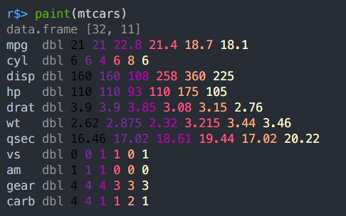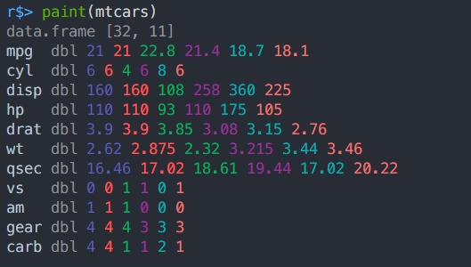 paintパッケージを使用してデータフレームをプレビューすると、このような感じで各列の先頭数個の値が色分けされた状態で表示されます。 動作は極めて高速なので、ぱっと確認したいときには便利そうです!
