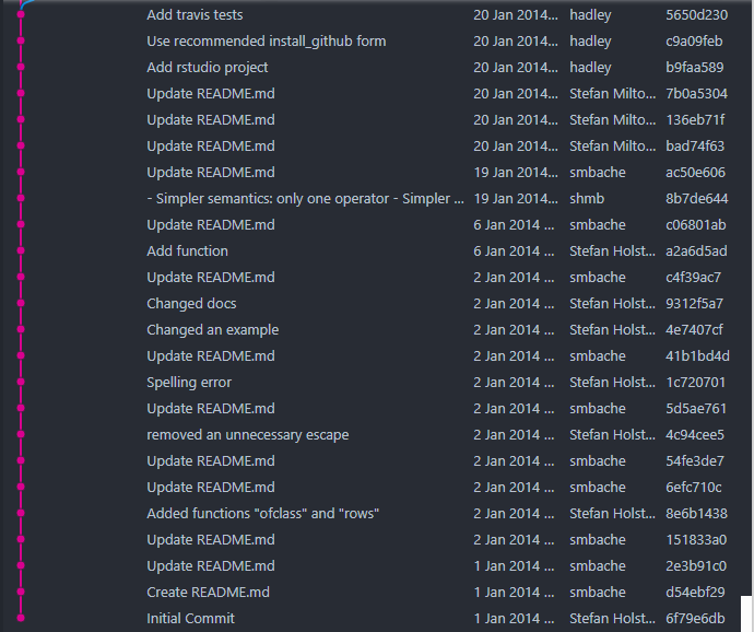 Looking at magrittr's commit history, Stefan started development on January 1, 2014, and just 19 days later Hadley Wickham also committed. You can see that Hadley was collaborating from the very beginning.