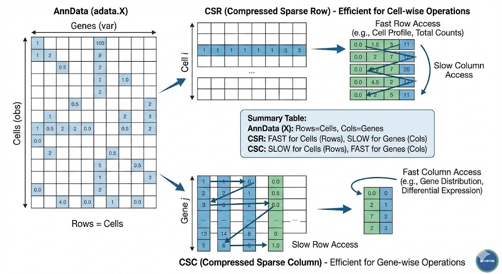 バイオインフォマティクスでは、シングルセルRNA-seqデータのような「細胞 × 遺伝子」の巨大な行列を扱いますが、各細胞で発現している遺伝子は全遺伝子のごく一部のため、データは極めてスパースになります。